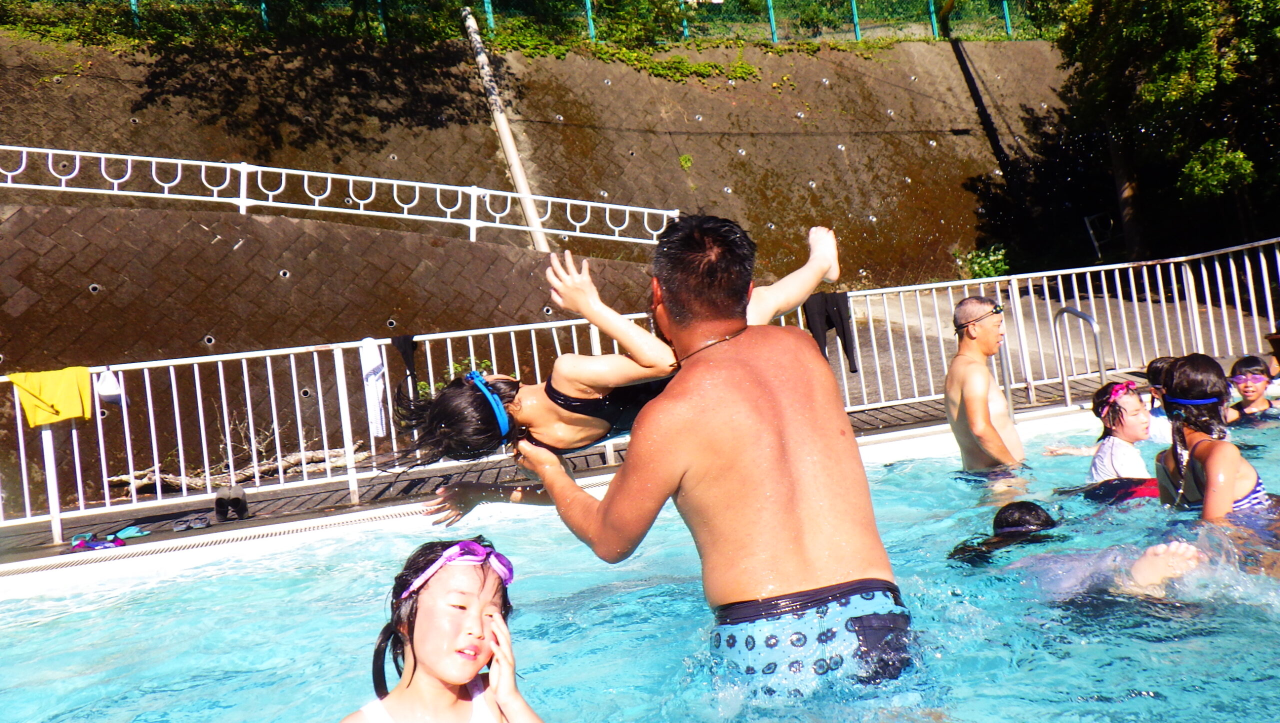 こんなダイナミックな遊びは、子ども達が行っているスイミングスクールでは絶対にできないでしょうね(笑)