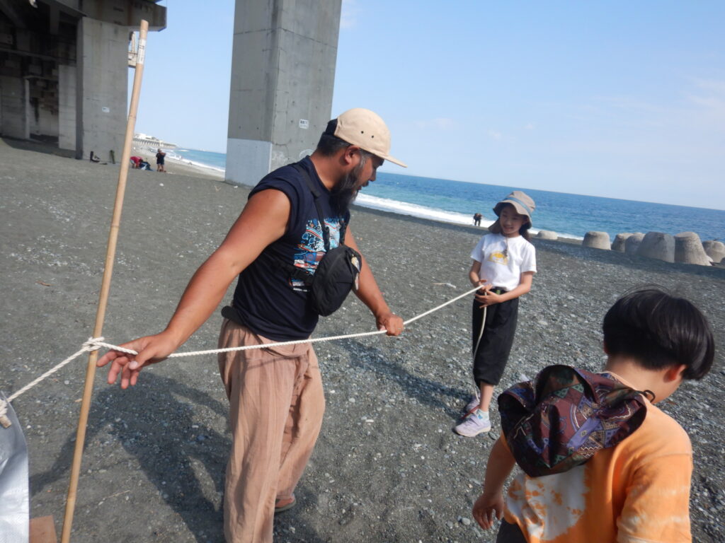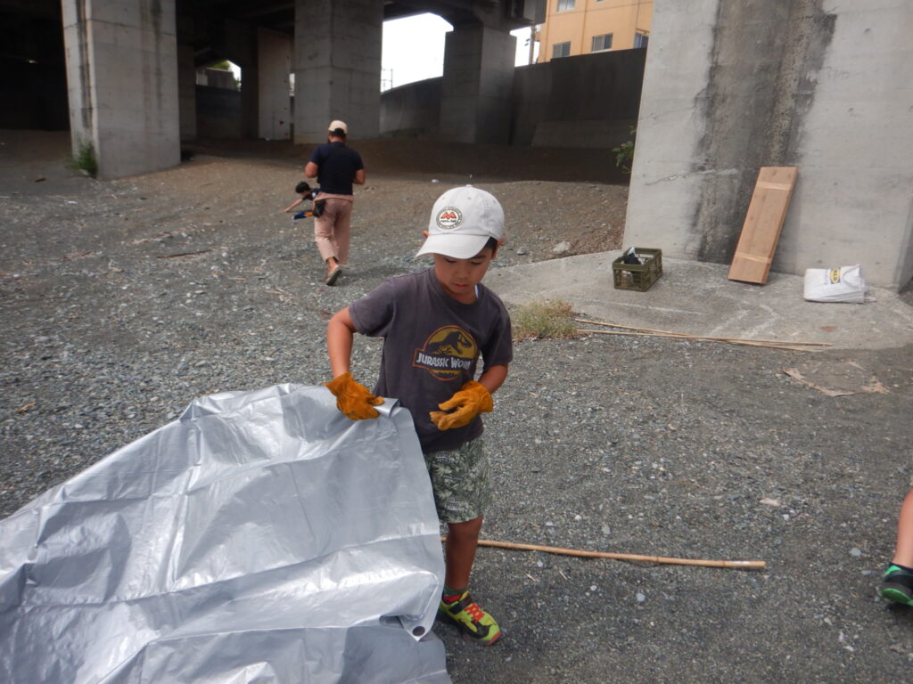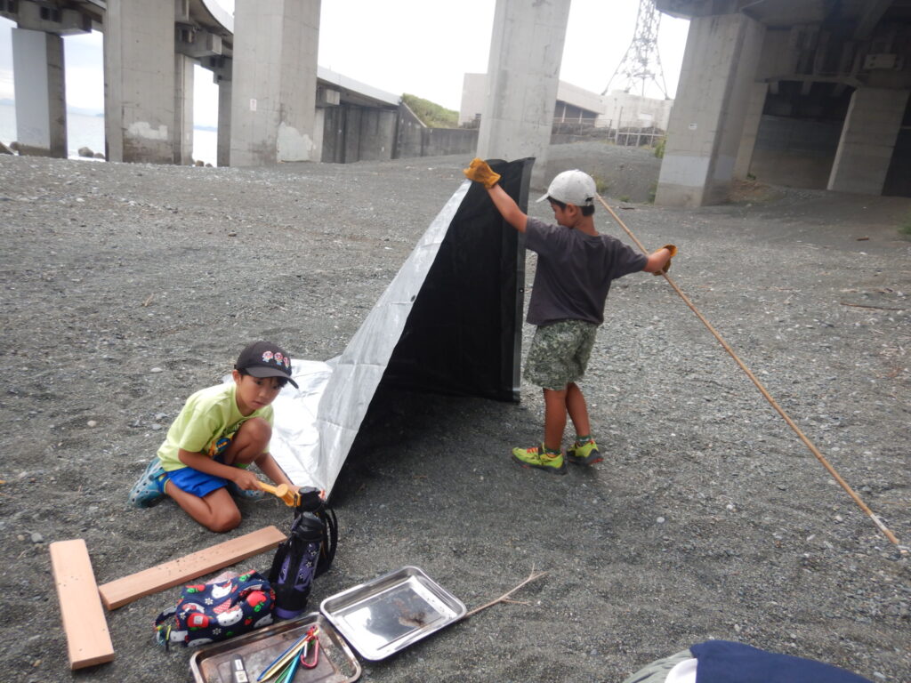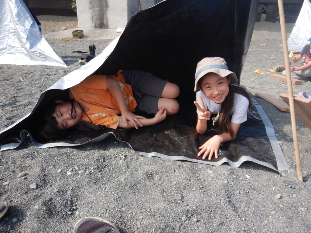 前回までは『焚火の準備で活動が終わっちゃった』や『ロープ難しくてできない』など、技術と時間の問題から焚火とロープ・タープのどちらかにしか挑戦できない子がいましたが、今回は全員が両方に挑戦し、完成までたどり着くことができました。