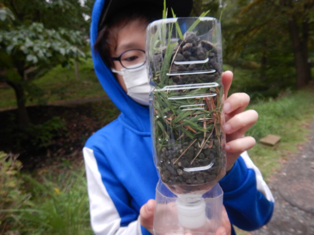 今回のろ過装置はペットボトルを容器にし、緑道にある自然素材と特別アイテムのキッチンペーパー1枚を使ってつくっていきます。