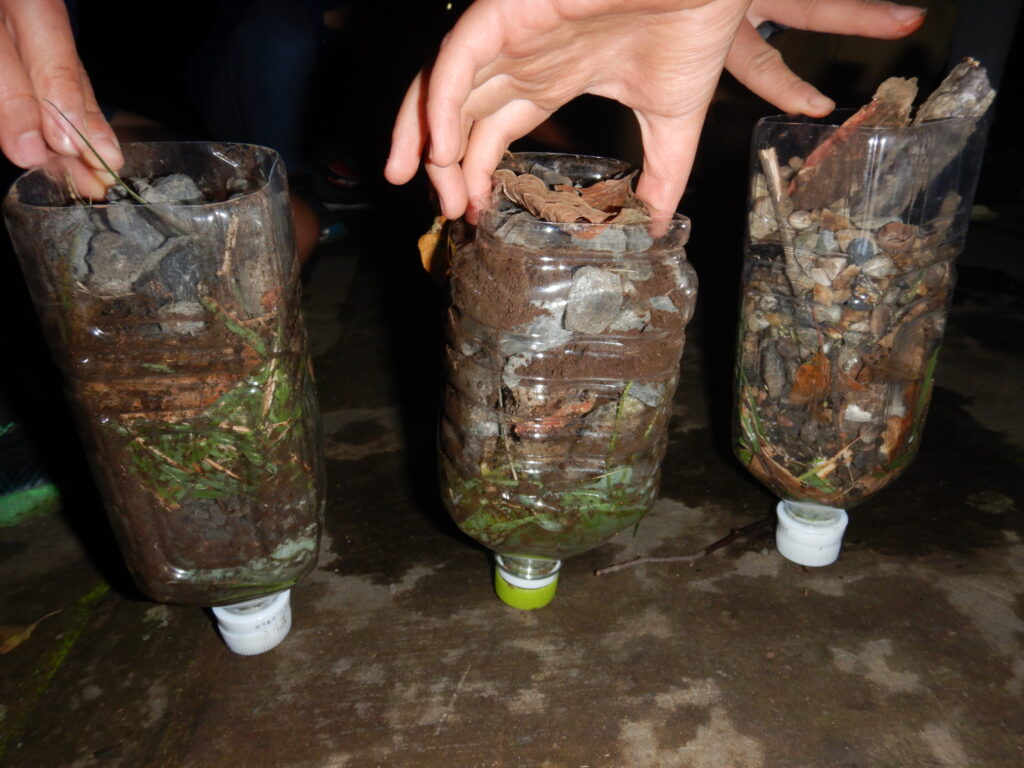 泥水が透明となり嬉しい子ども達は「やってみる!」と意気込みペットボトルの飲み口付近からキッチンペーパーを抜き取ります。