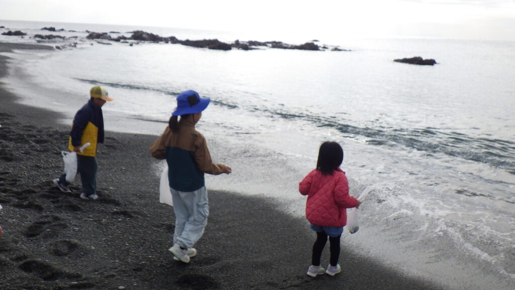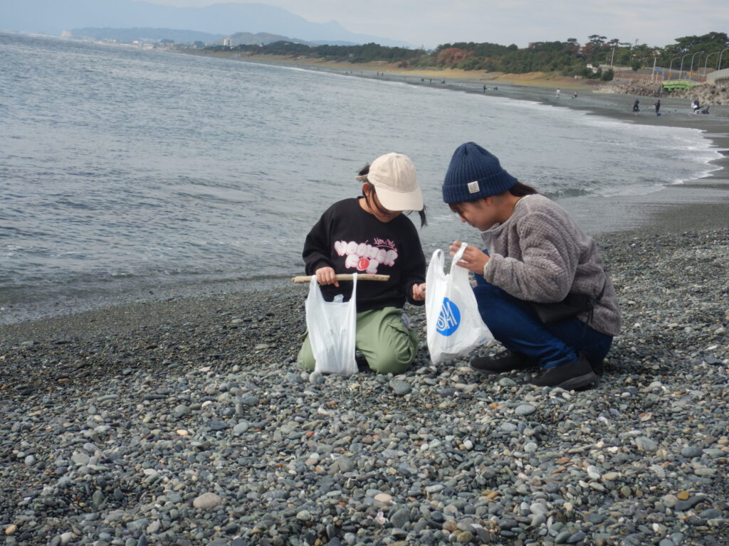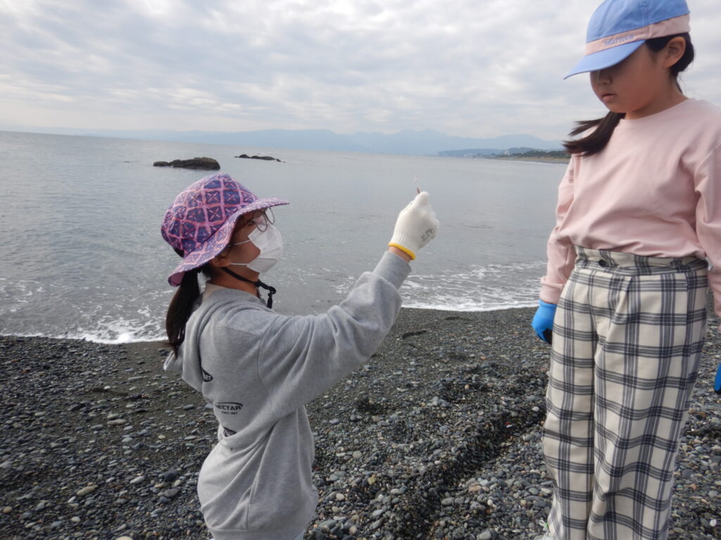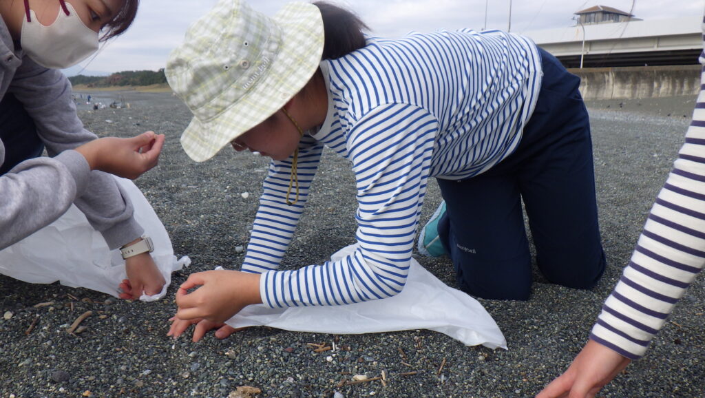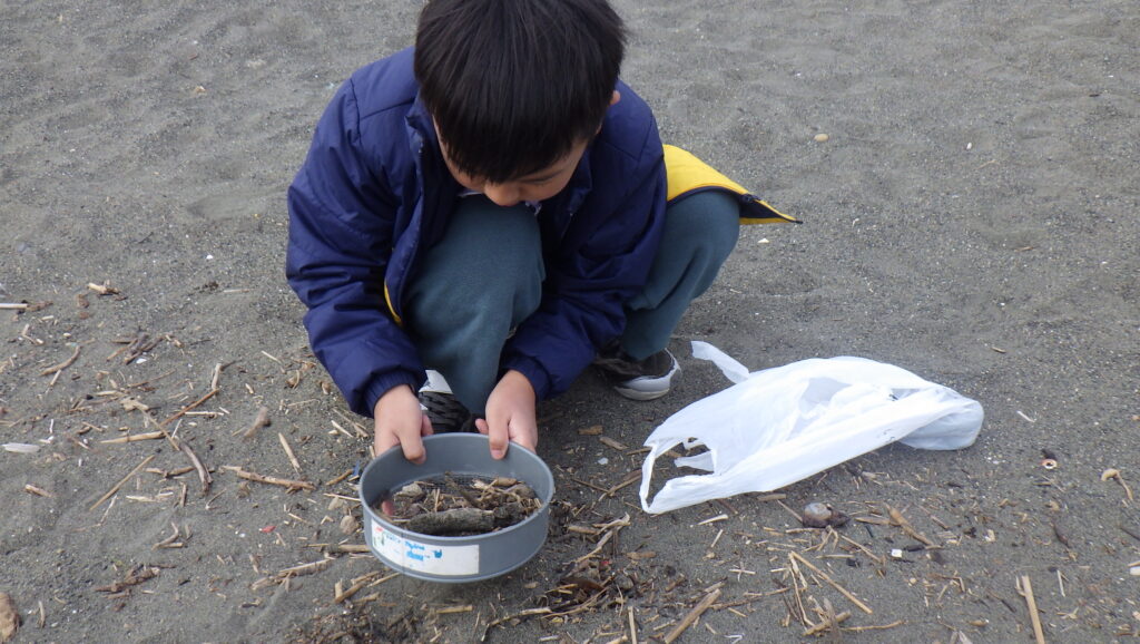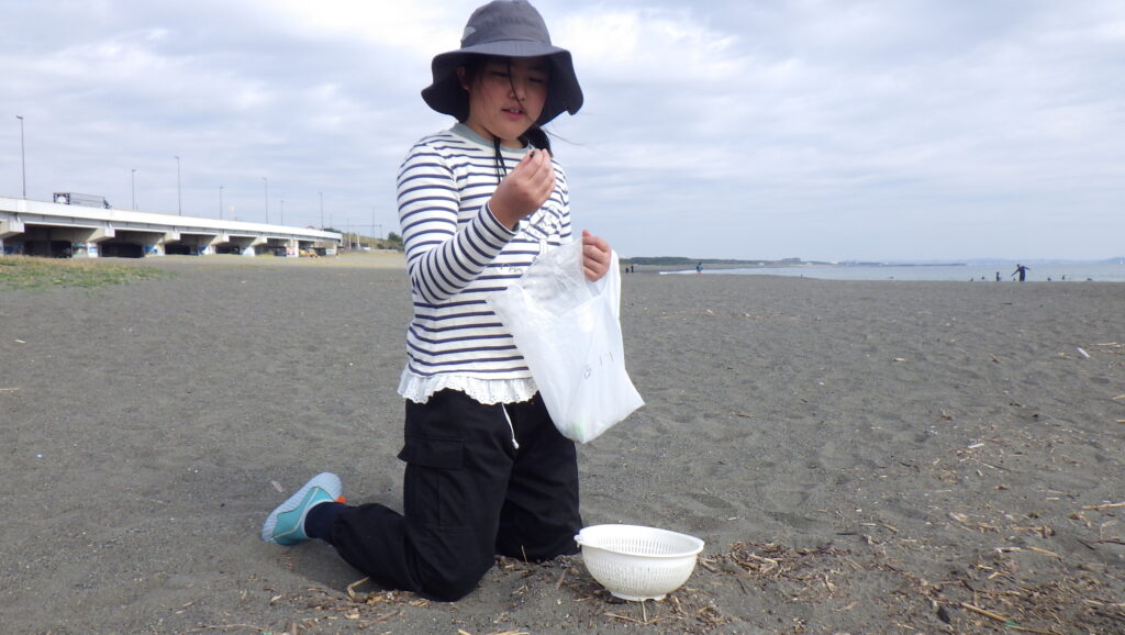 続いて訪れた砂浜が広がる海岸では、貝殻やマイクロプラスチック、漂着ゴミを拾い集めました。