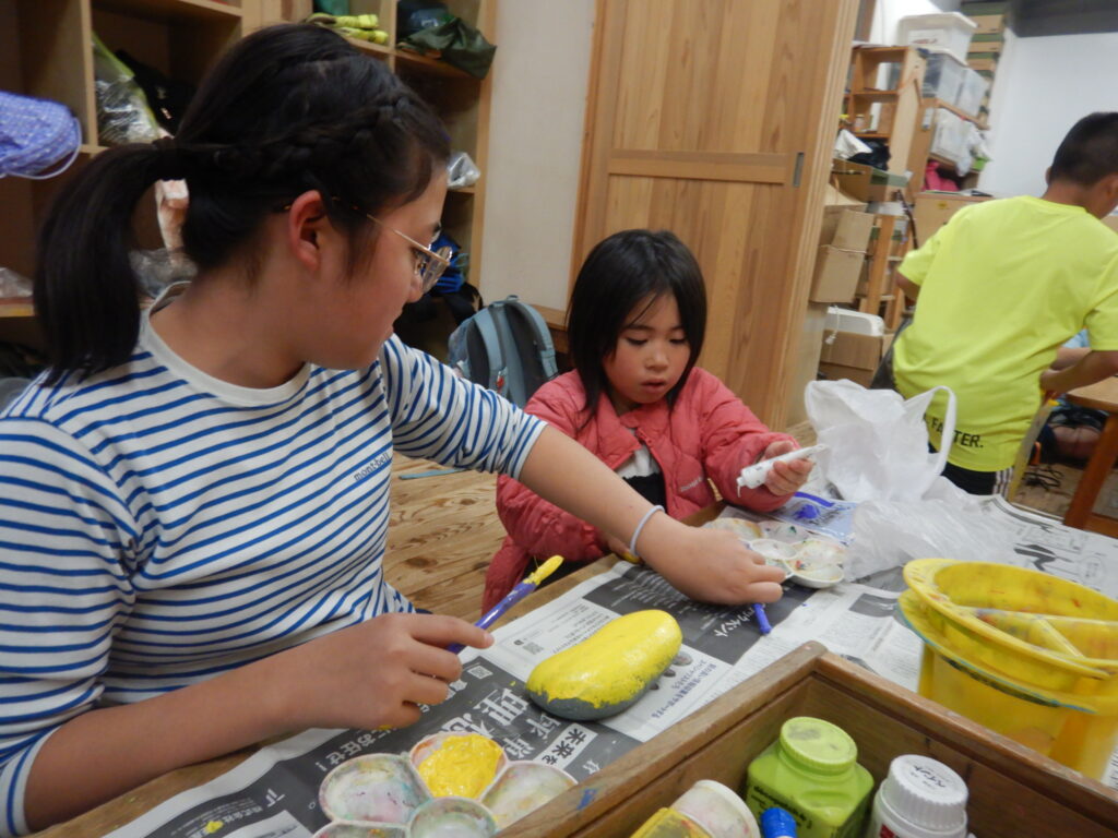 拾ってきた石に絵の具で色を塗り好きなキャラクターや今回の活動の思い出を描いている子。