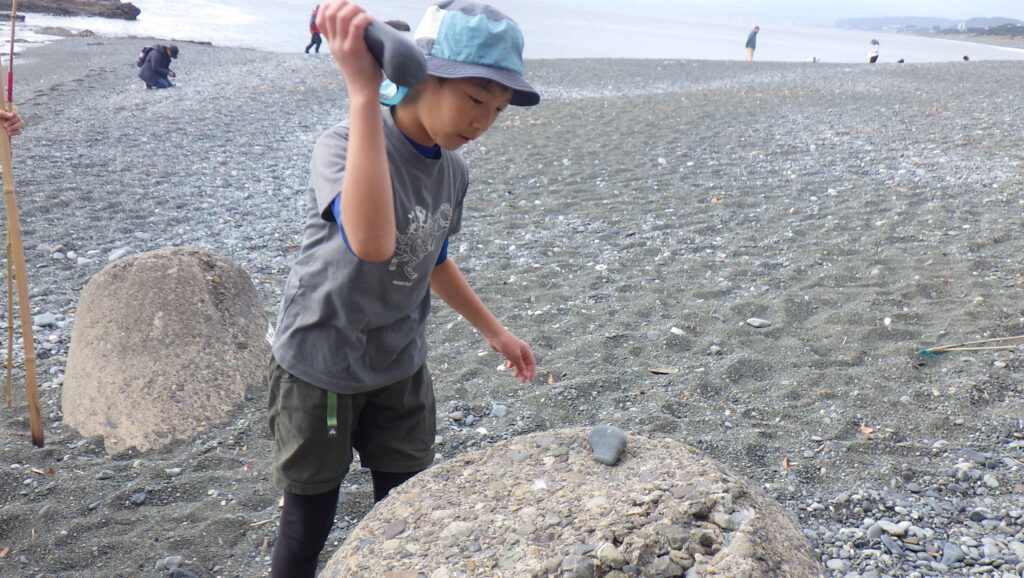 男の子たちは手のひらより少し大きめの石を拾い上げ、割ってみたり削ってみたり。