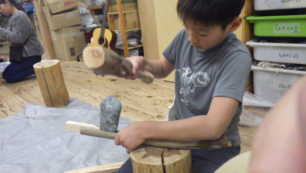 海岸から拾ってきた竹と石を組み合わせ、本物さながらの打製石器を自作している子。