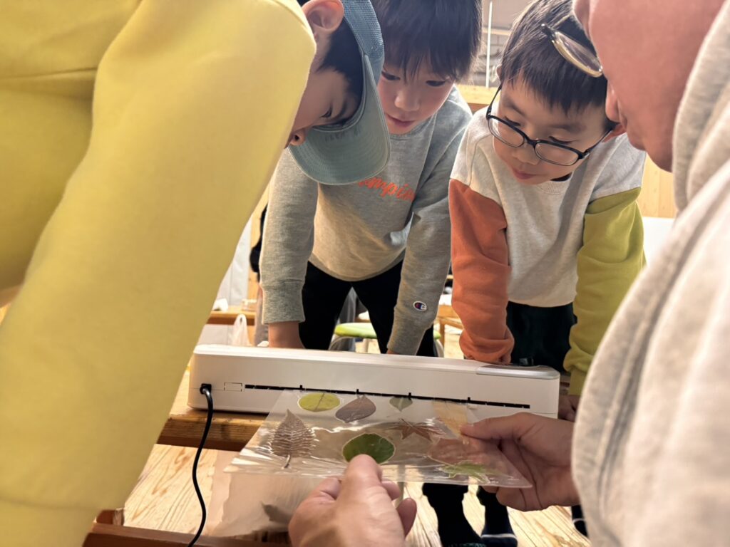 機械から出てくるラミネートされた葉を見て「おぁぉ!」「僕の葉っぱ綺麗にできてる!」と嬉しそうでした。
