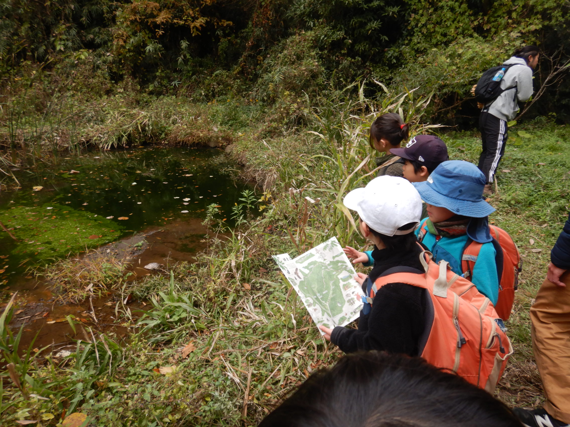 「カエルいるかな?!」「この時期は冬眠中なんじゃない?」と生き物探しをする子ども達。
