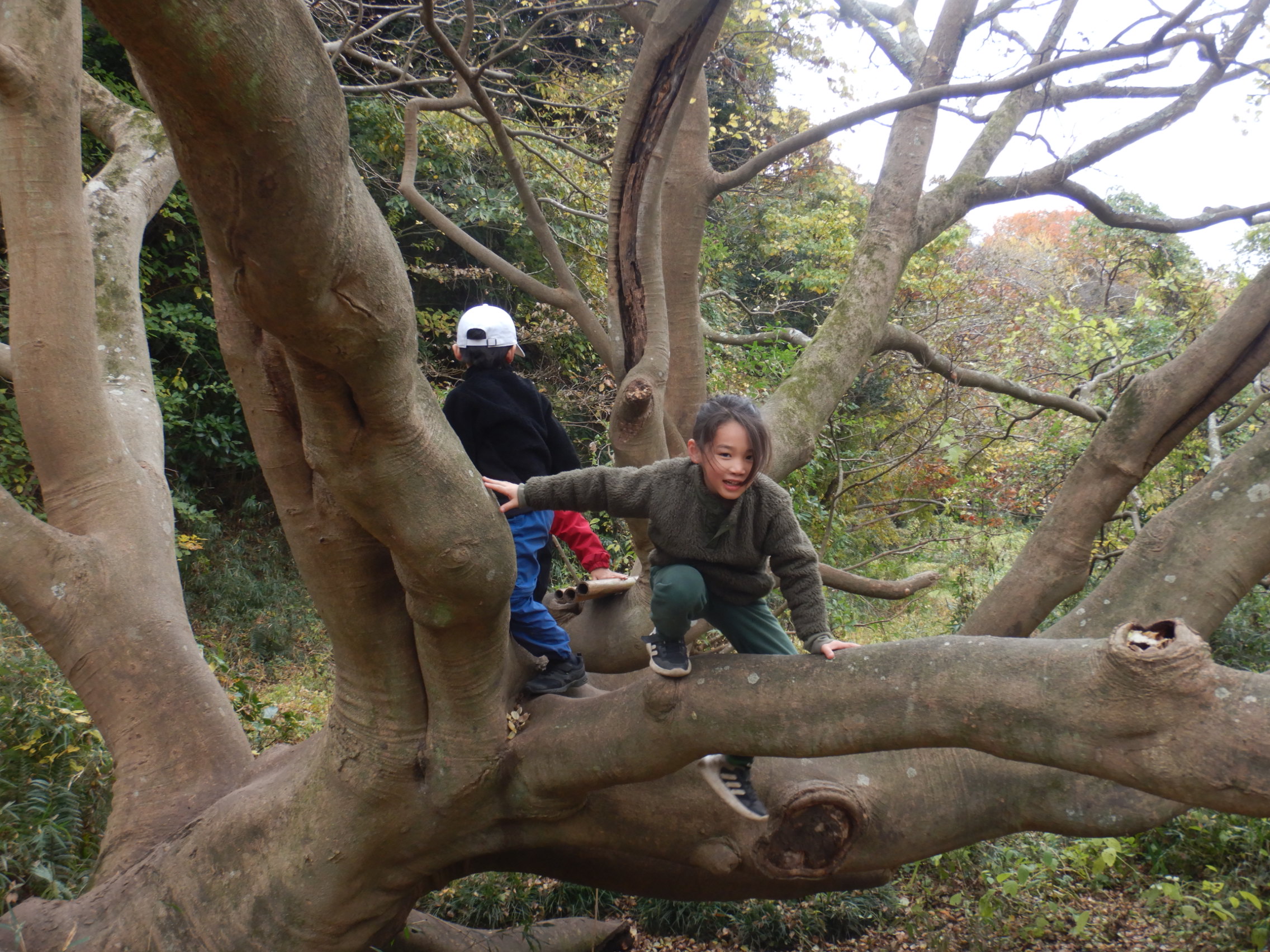 子どもの身長より高い枝に登って「ちょっと怖いけど、イエーイ!」