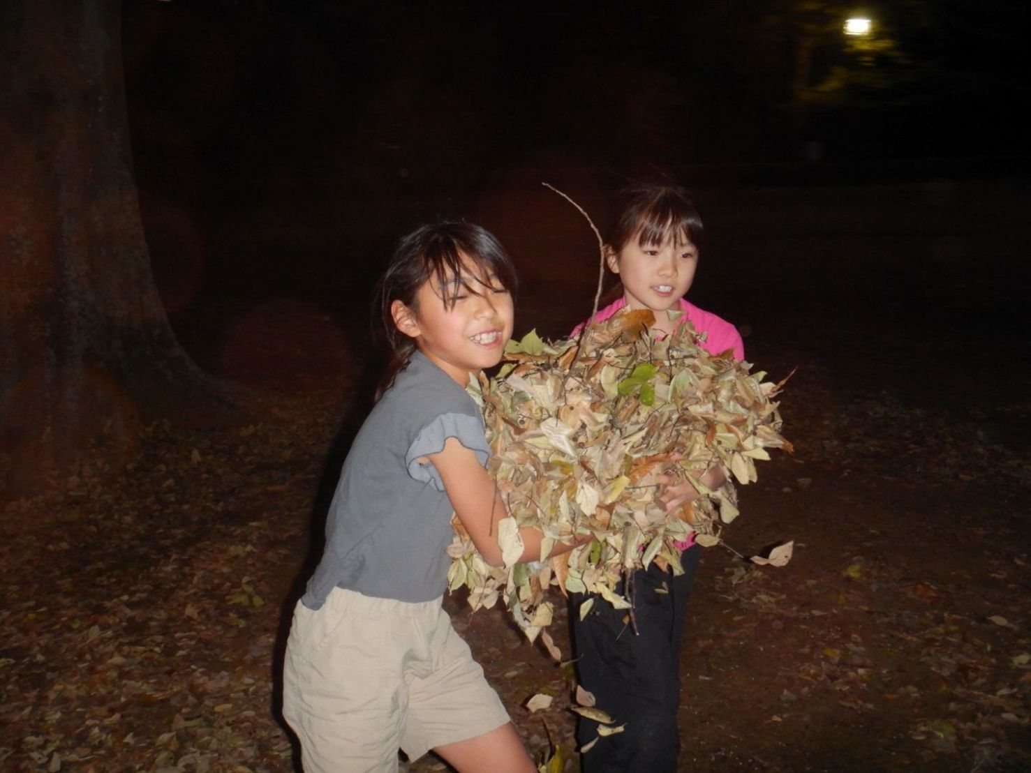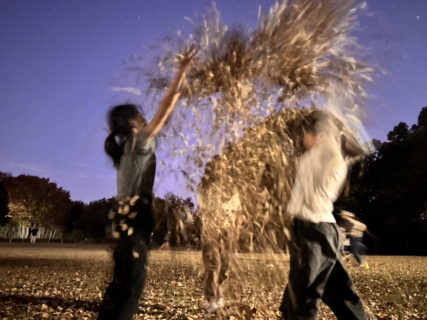 集めた落ち葉を可能な限り1人ずつ抱え「せーの」の合図で一斉に空へ。