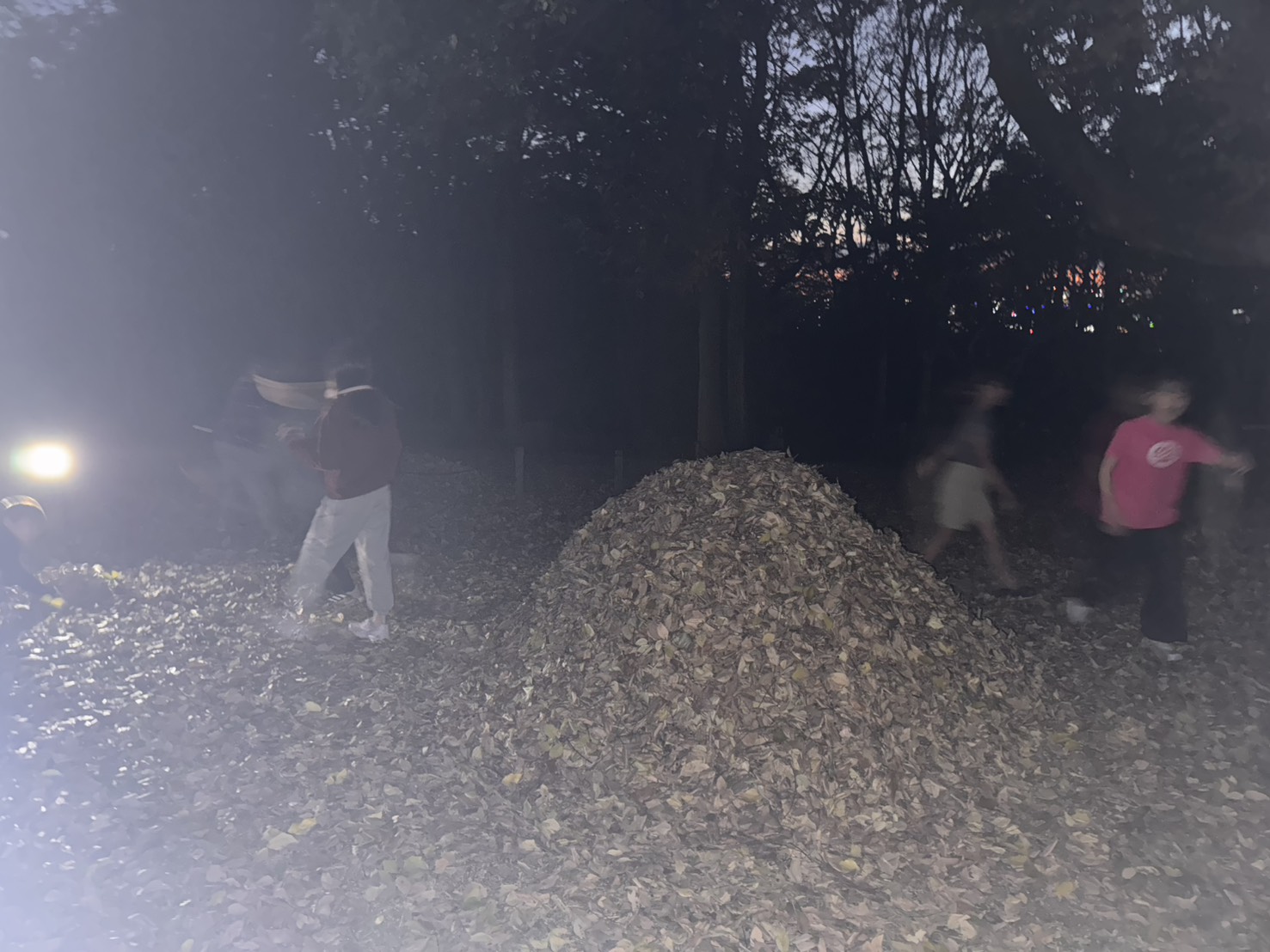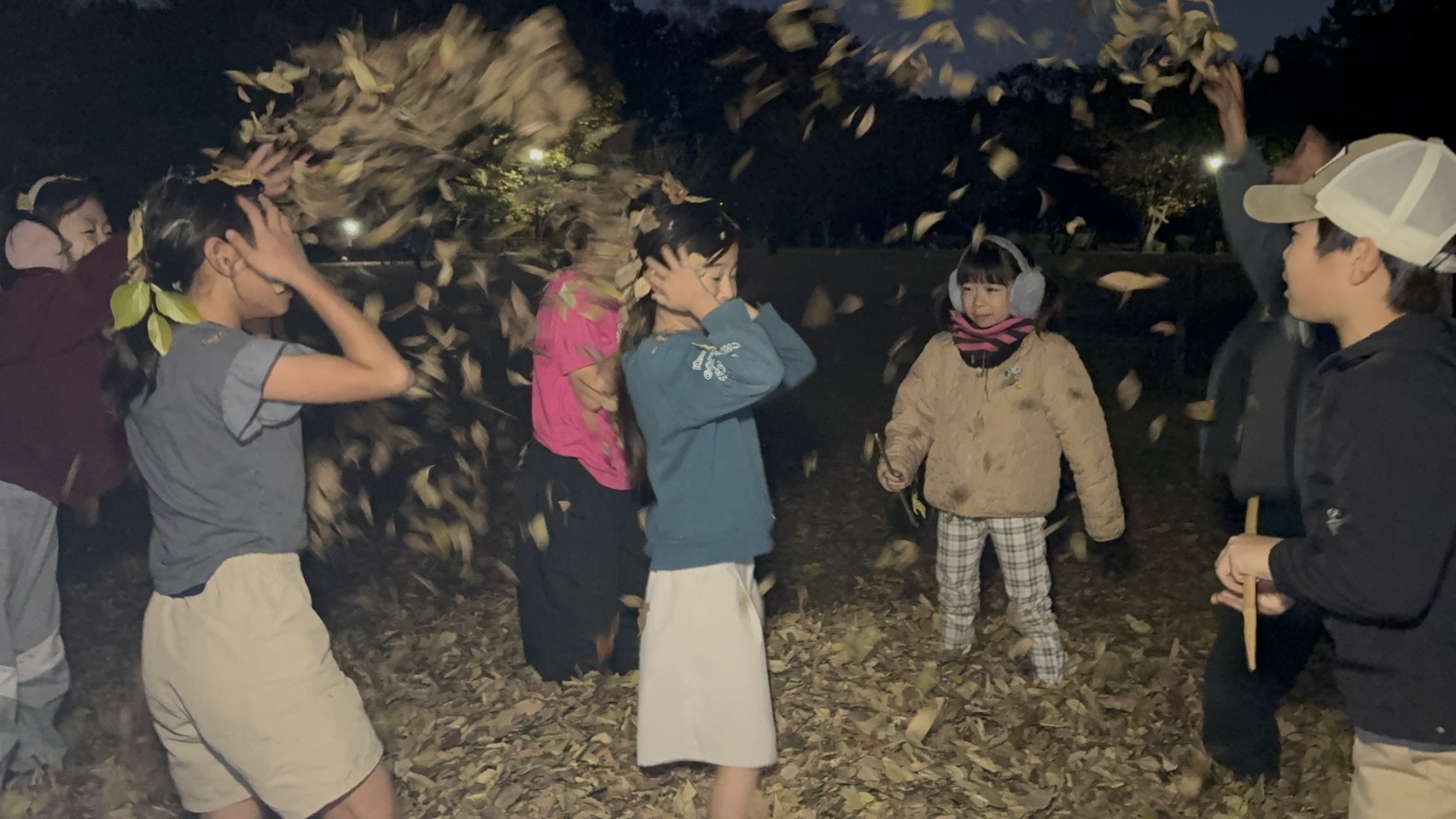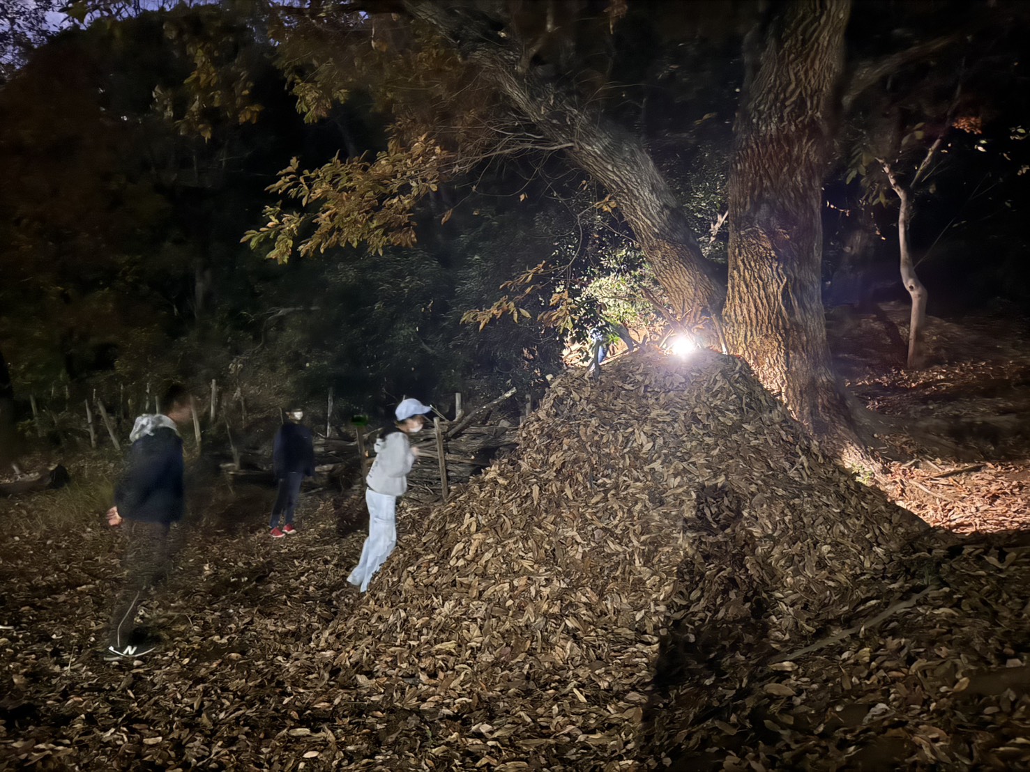 五感を最大限使い、落ち葉の感触や匂い、踏んだ時の音、冷たい空気感や暗闇での見え方を全身で味わいながら自然や友達と共に過ごす時間を楽しんでいました。