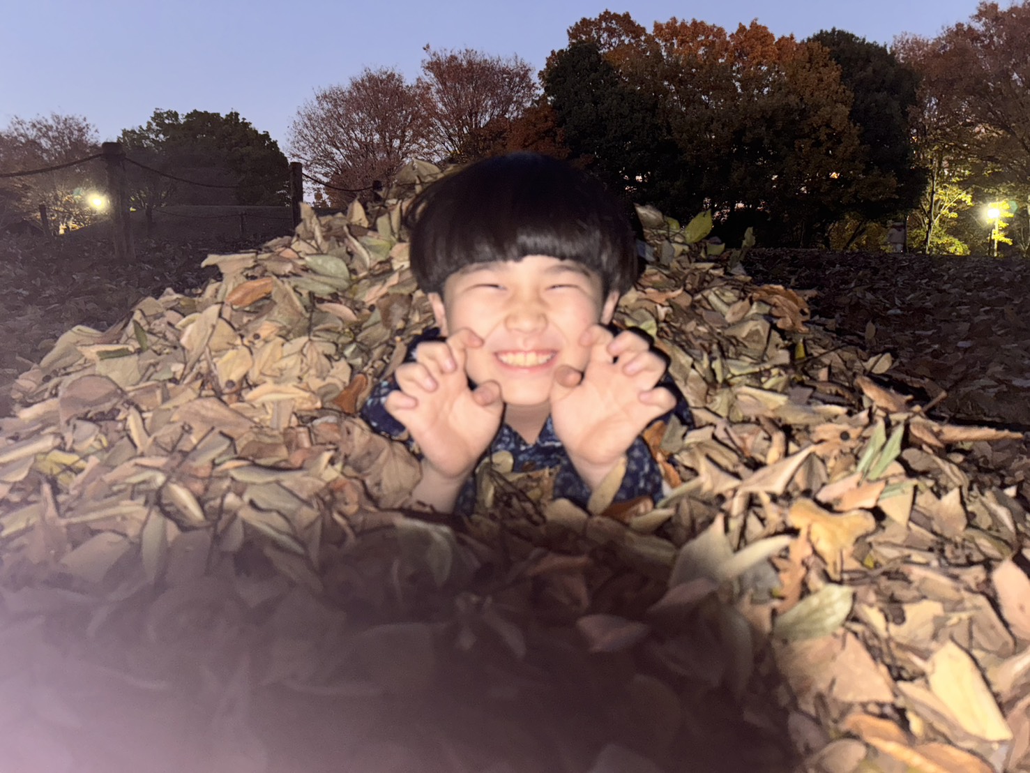 落ち葉のにおい、カサカサと聞こえる音、ふかふかした葉っぱの暖かさを全身で感じ子ども達はこの笑顔!