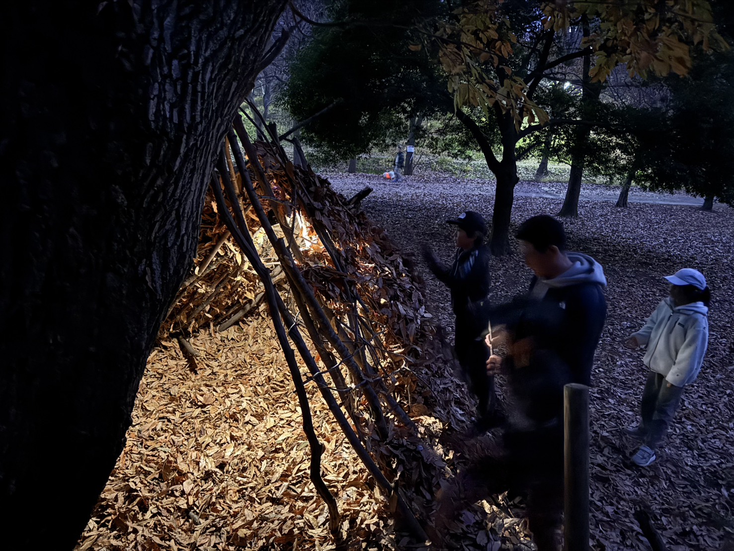 「あとは落ち葉をかければ完成だから急ごう!」辺りが暗くなり始め、急ぎながら枝が崩れないよう慎重に手を動かし