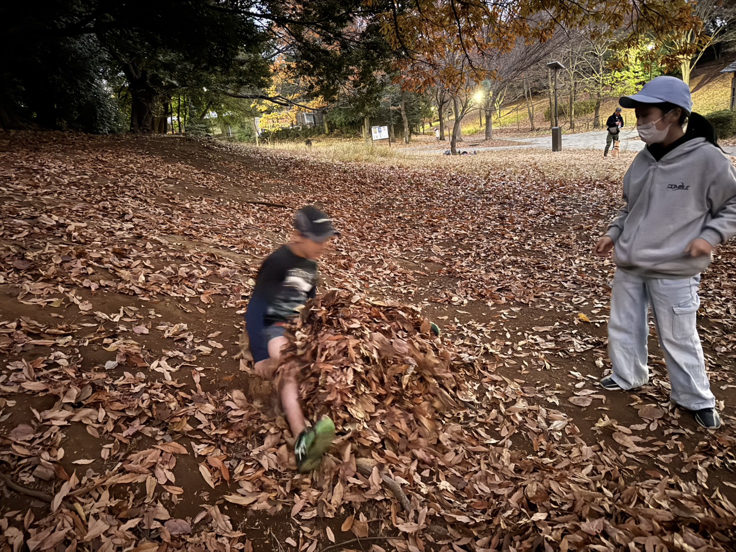 と遊ぶ時の楽しい想像が次々と飛び交い、いつの間にか山盛りの落ち葉が完成!