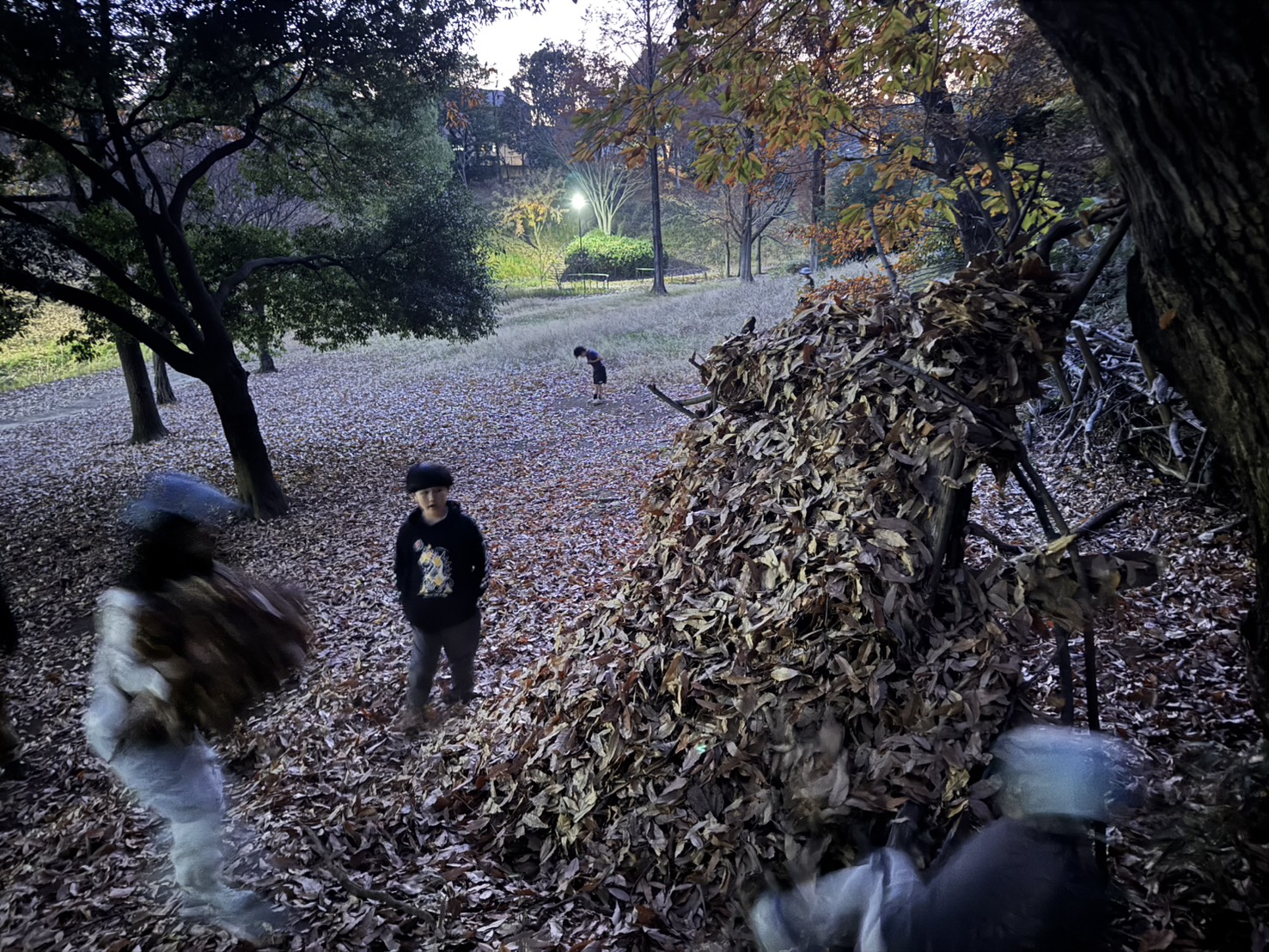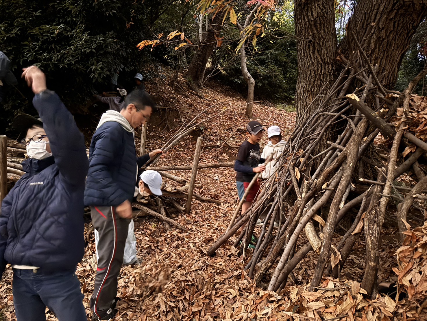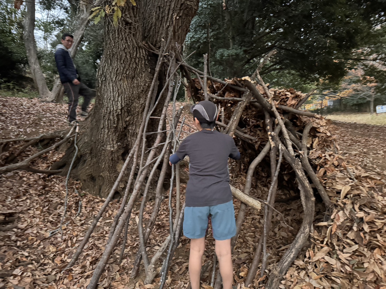 また別の日では、落ち葉と長い木の枝を集め「秘密基地」作りが始まりました。