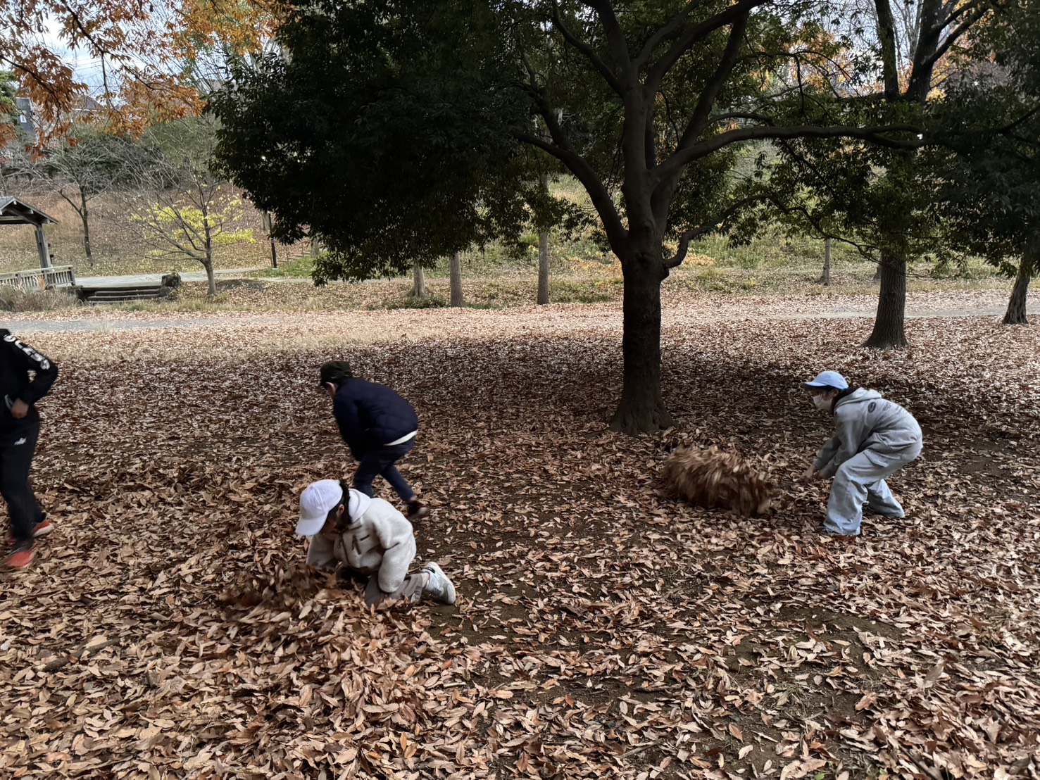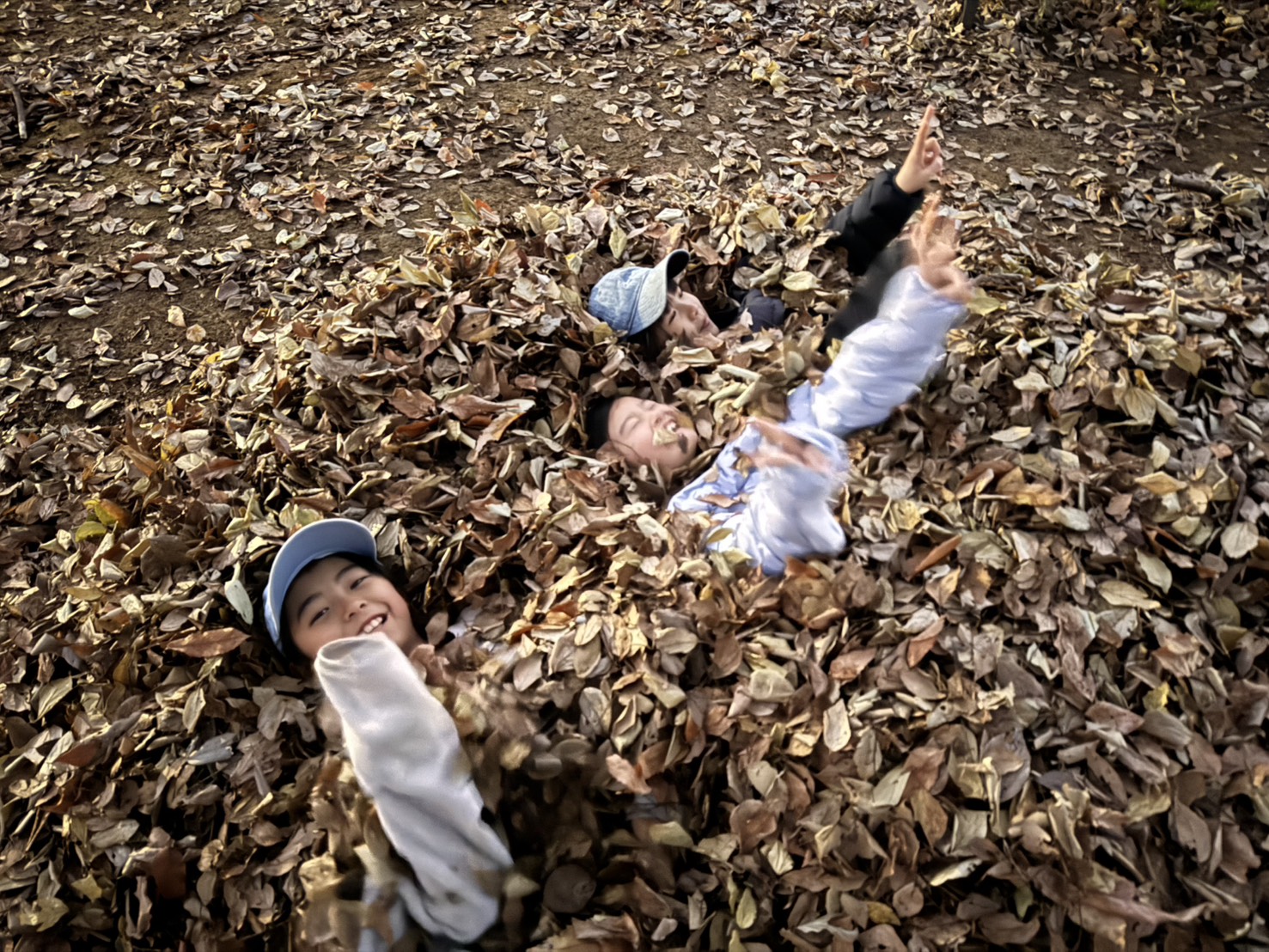 まずは、寝転がって落ち葉の中に埋まる遊び。