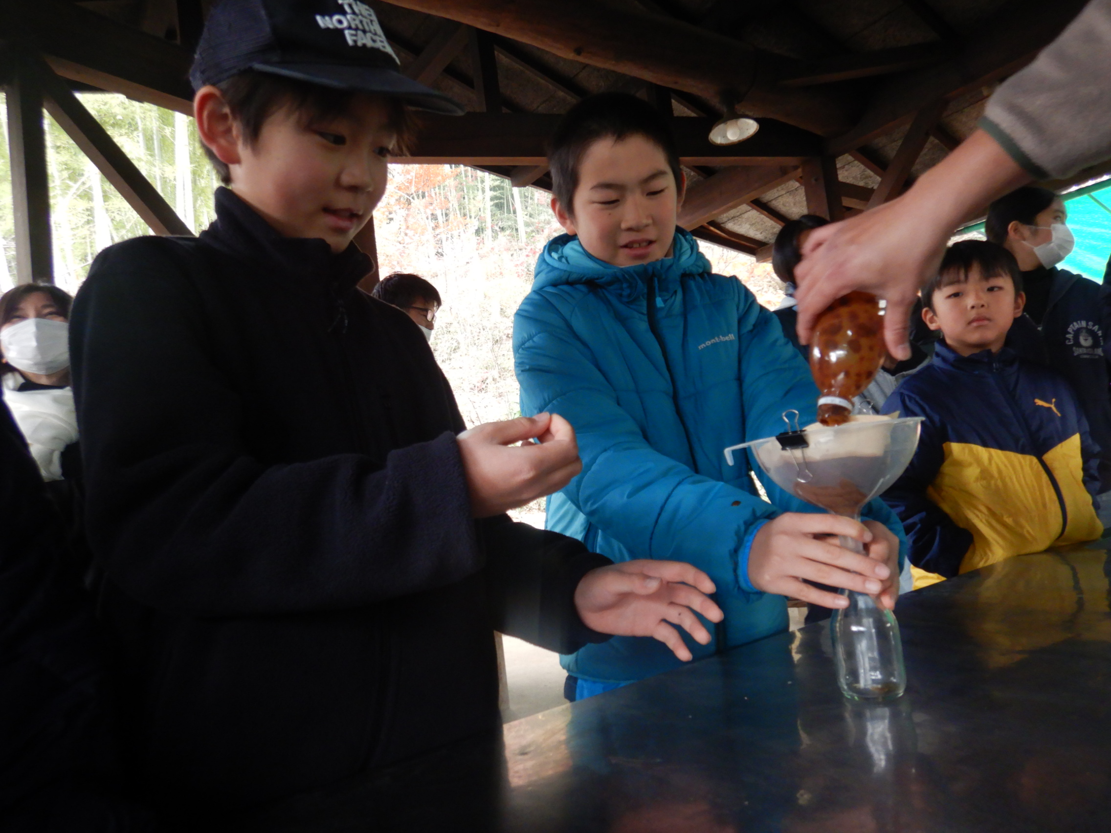 これをろ紙の上に出すと、下のビンには重力によってポタポタと醤油が落ちていきます。