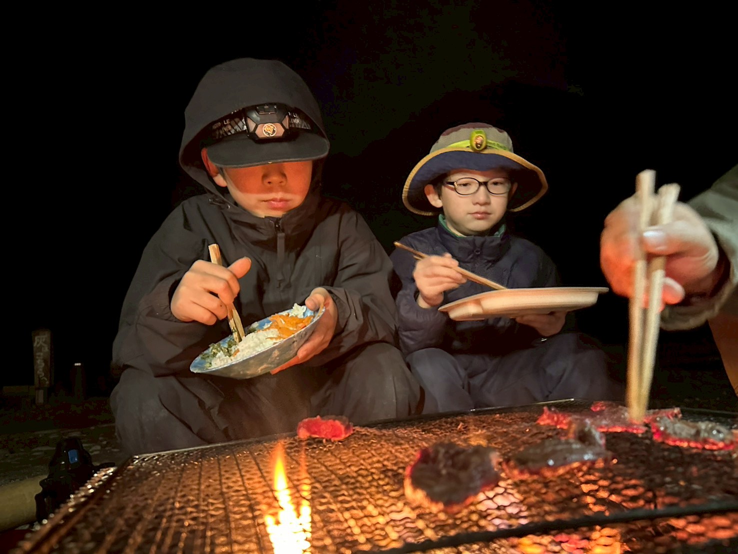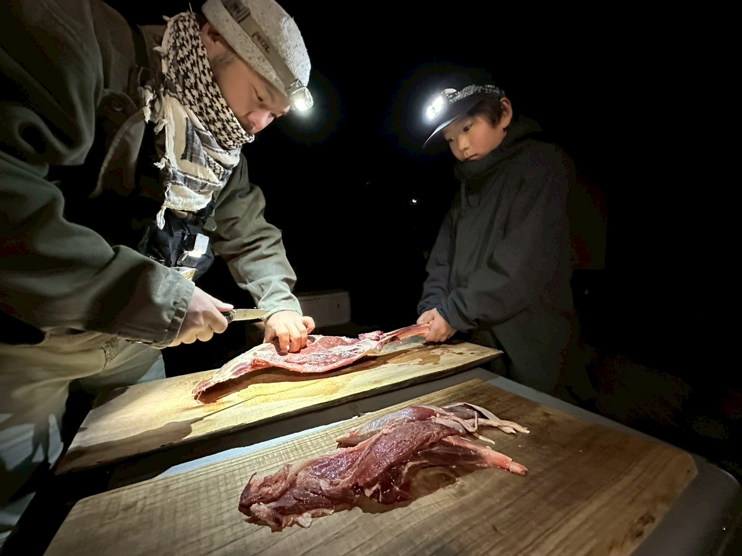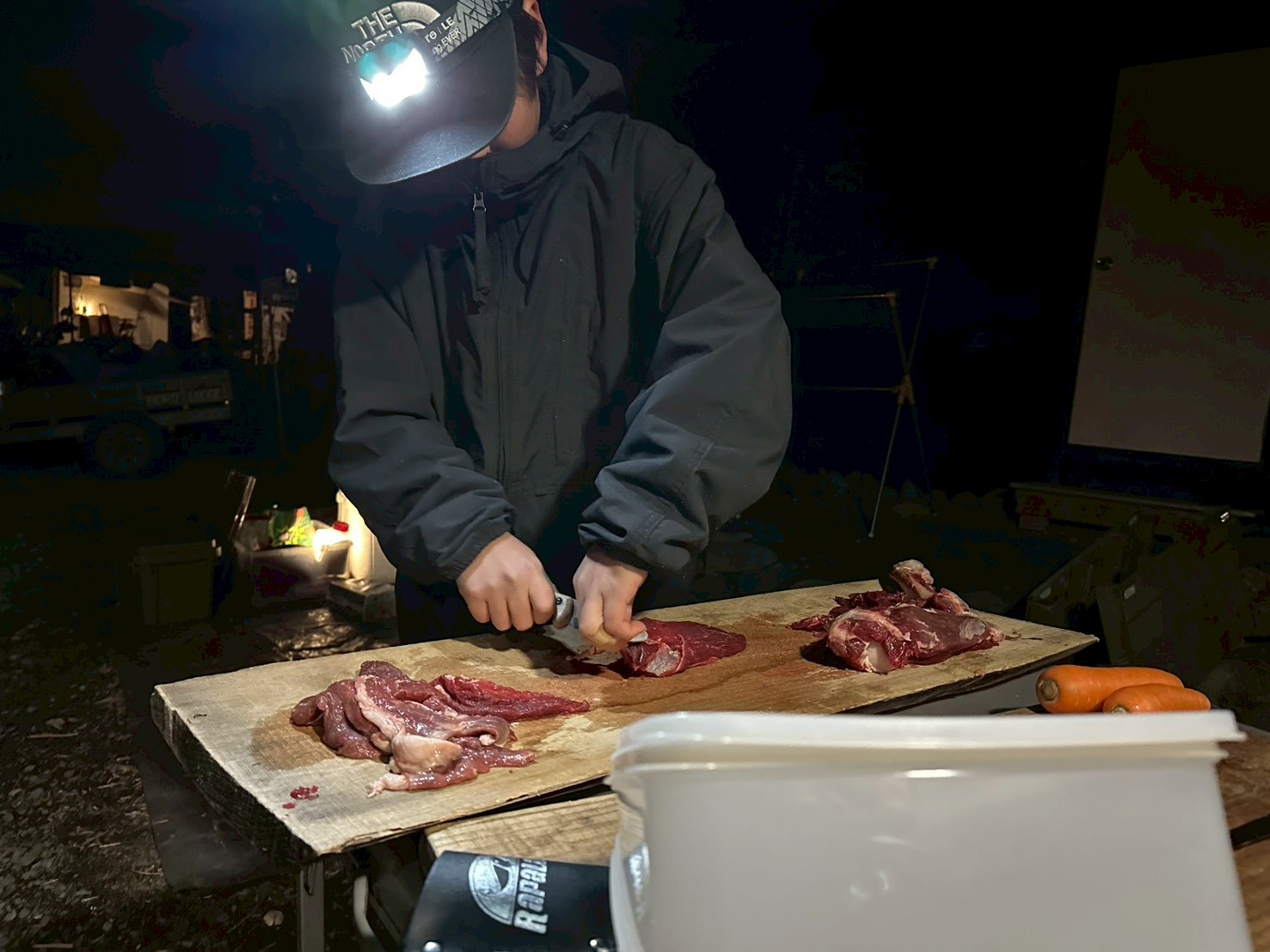 初日から大きなジビエ肉との出会い、慣れない火おこしでの苦労、そして自分たちで作り上げた夕食。