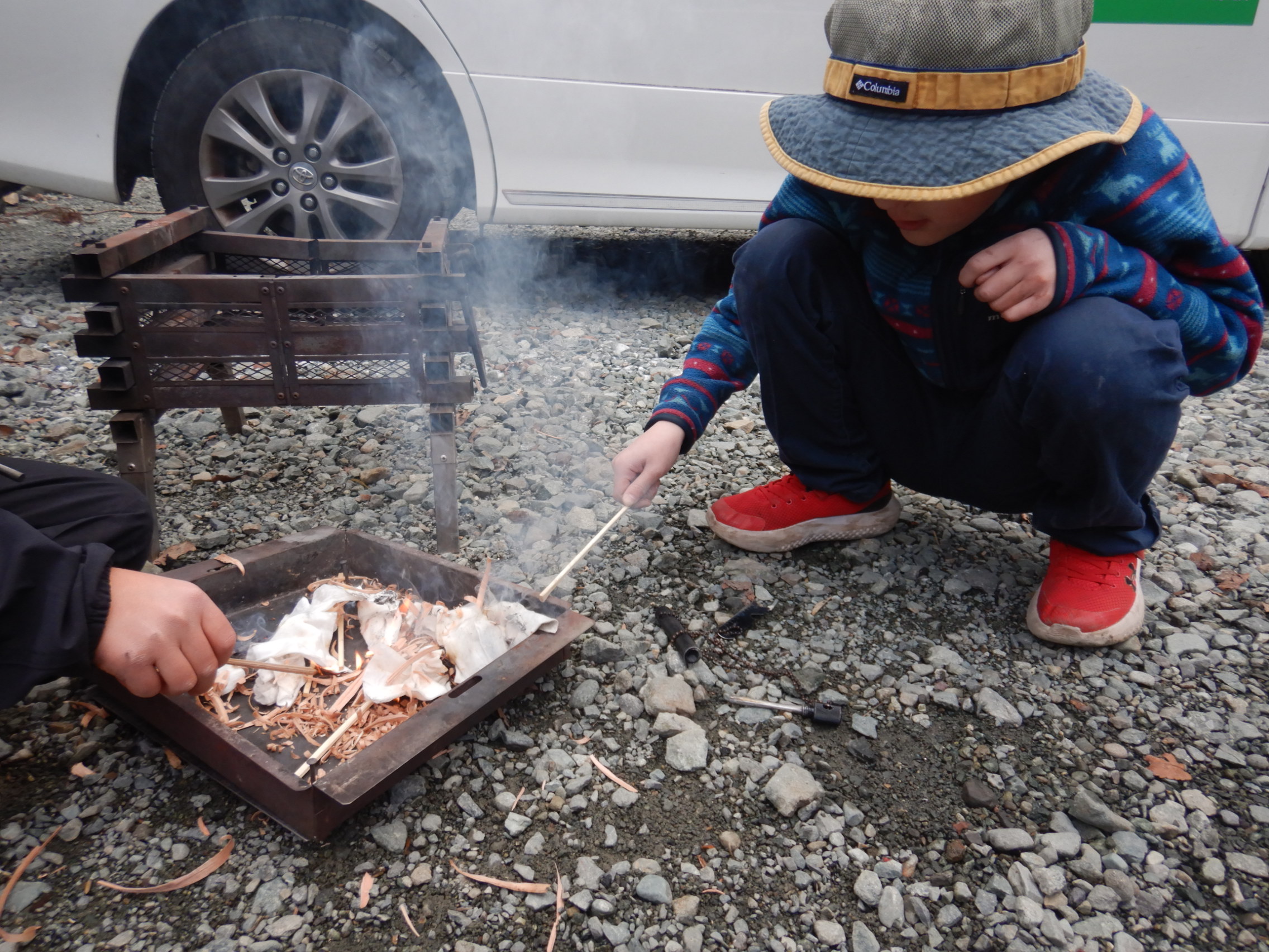 「急げ!すぐ消えちゃうから!」と2人でコットンや木くずを足しながら、なんとか安定した焚火を作ることができました。